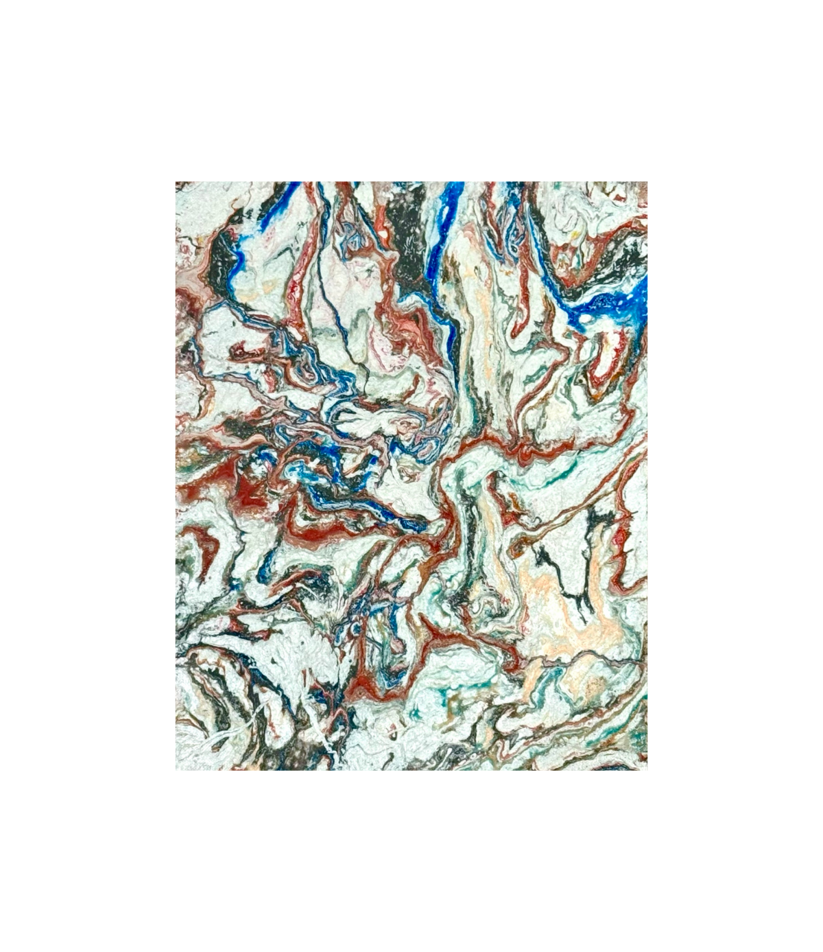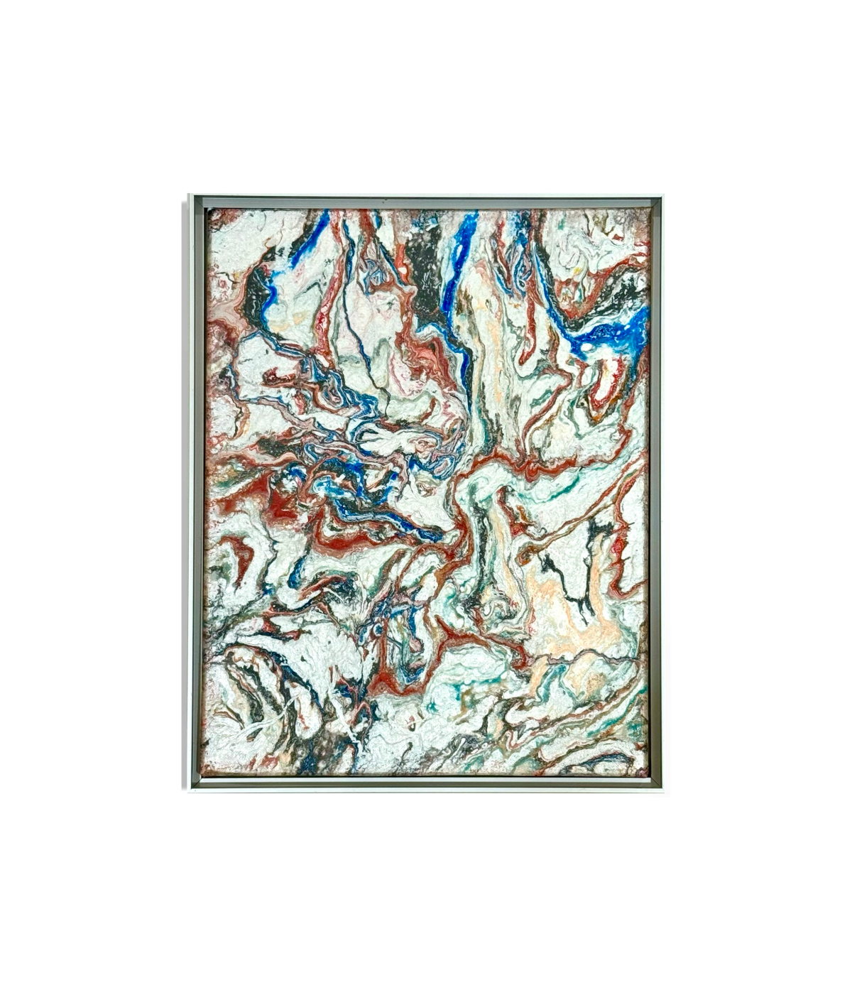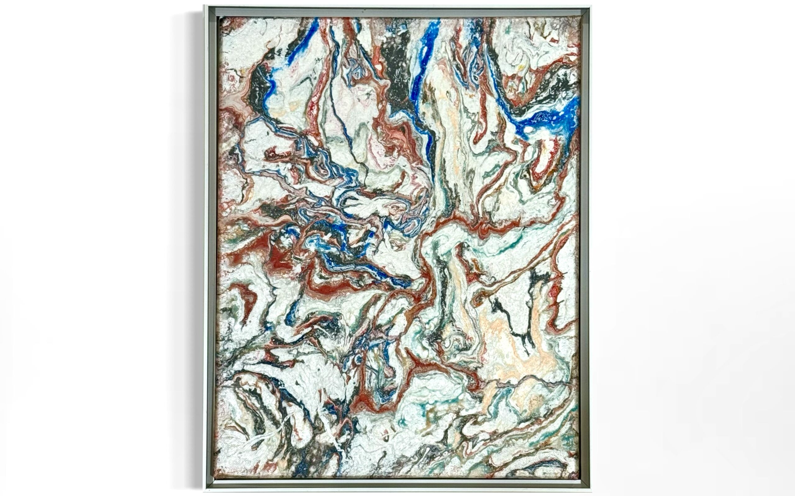 A bold poured-acrylic abstract with swirling red, blue, and white tones. The metallic frame gives the piece a sharp, modern finish befitting its title, “Captain America.”