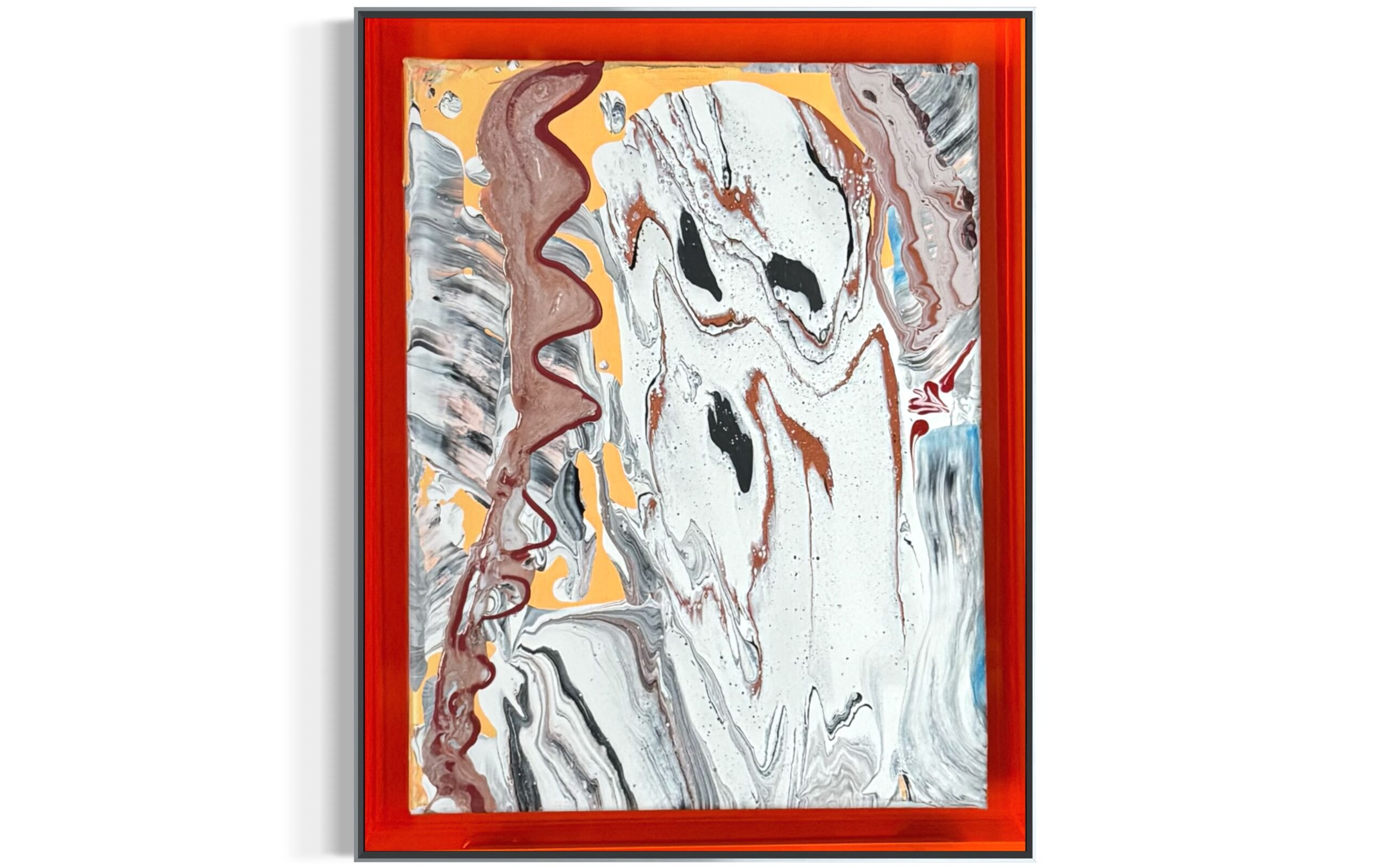 A mixed-media acrylic piece defined by fluid, marbled movement and bold contrasting colors. The neon orange plexiglass floater frame gives it a sharp, contemporary edge, making the piece feel energetic and modern.