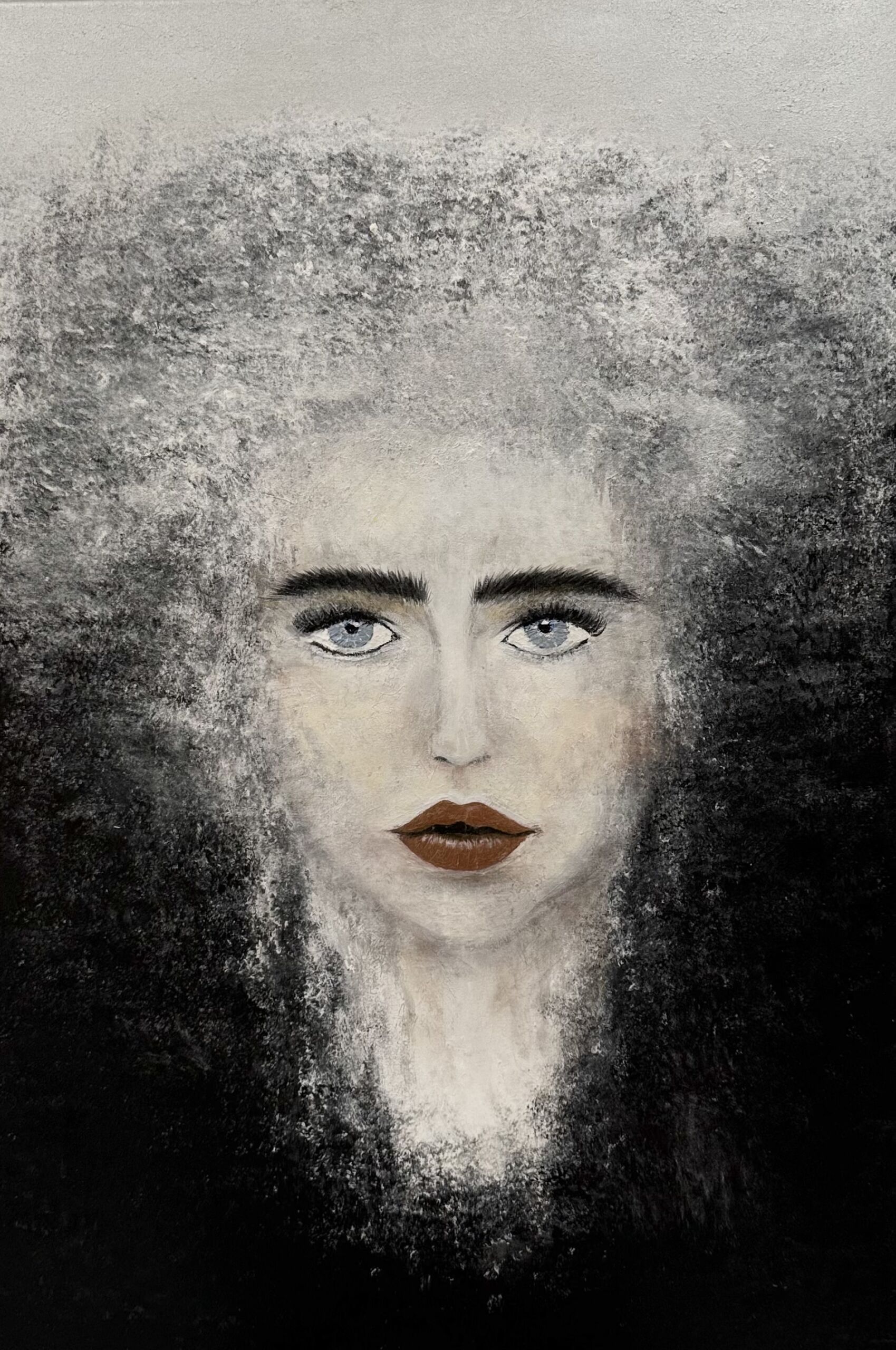 A haunting, ethereal portrait emerging from shadow and texture. Soft grayscale tones frame piercing eyes and defined lips, creating a presence that feels timeless, mysterious, and deeply feminine.
