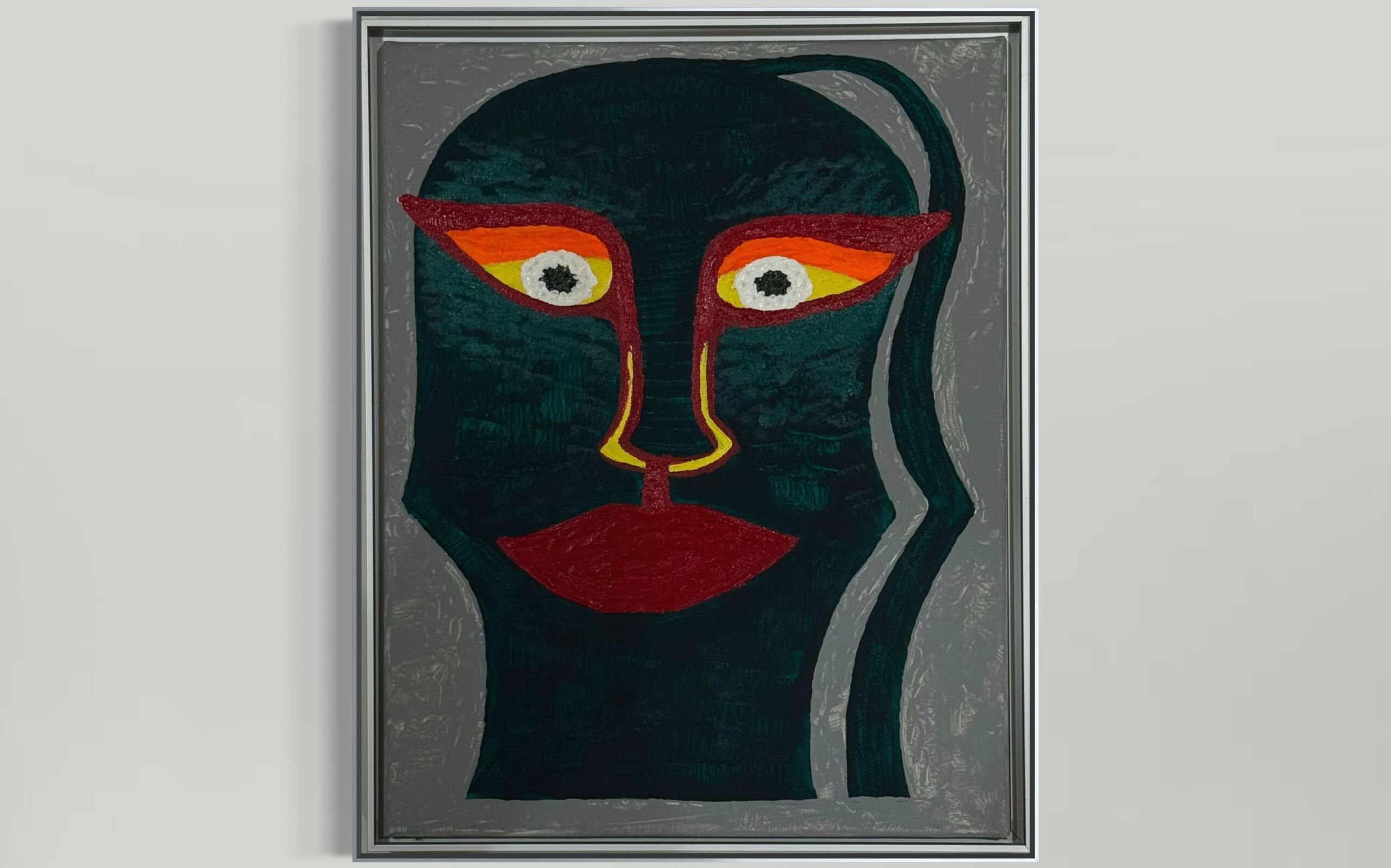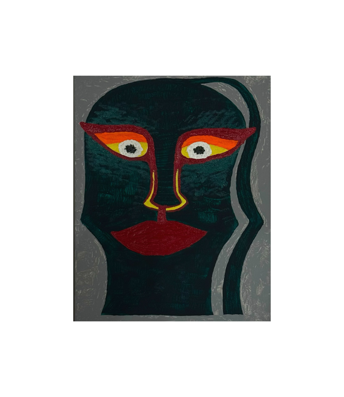 A bold abstract portrait defined by intense, fiery eyes and deep shadowed tones. The distorted silhouette and textured lines create a sense of silent tension—like a figure watching from another dimension, illuminated by inner heat.