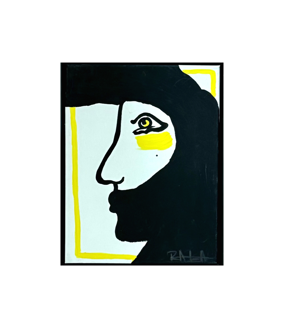 A bold, minimalist portrait of Marco, defined by strong lines, bright yellow accents, and a playful title.
